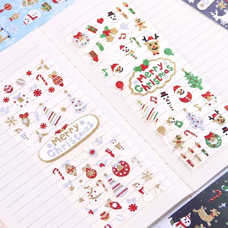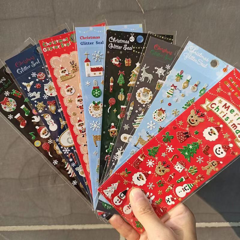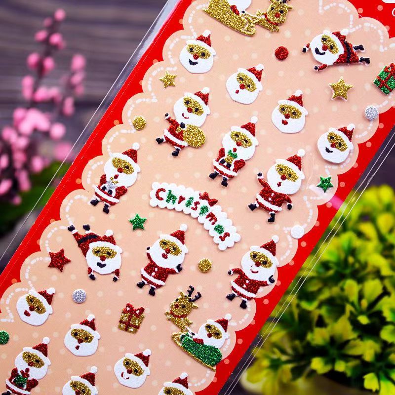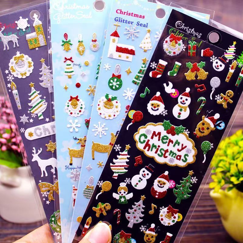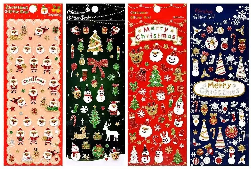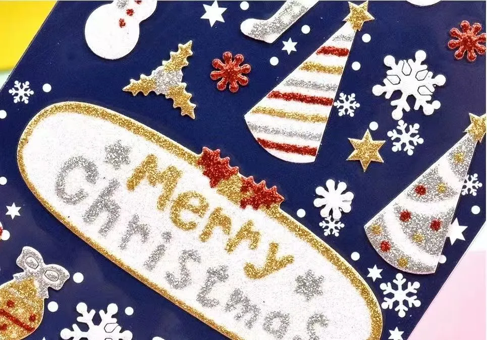 ໃຊ້ສະຕິກເກີ Christmas Glitter ເປັນອົງປະກອບຫຼັກຂອງບັດອວຍພອນ DIY, ຫຼືເພີ່ມຄວາມຮູ້ສຶກຂອງສາມມິຕິແລະ luster ທີ່ຈະພິມບັດອວຍພອນ.