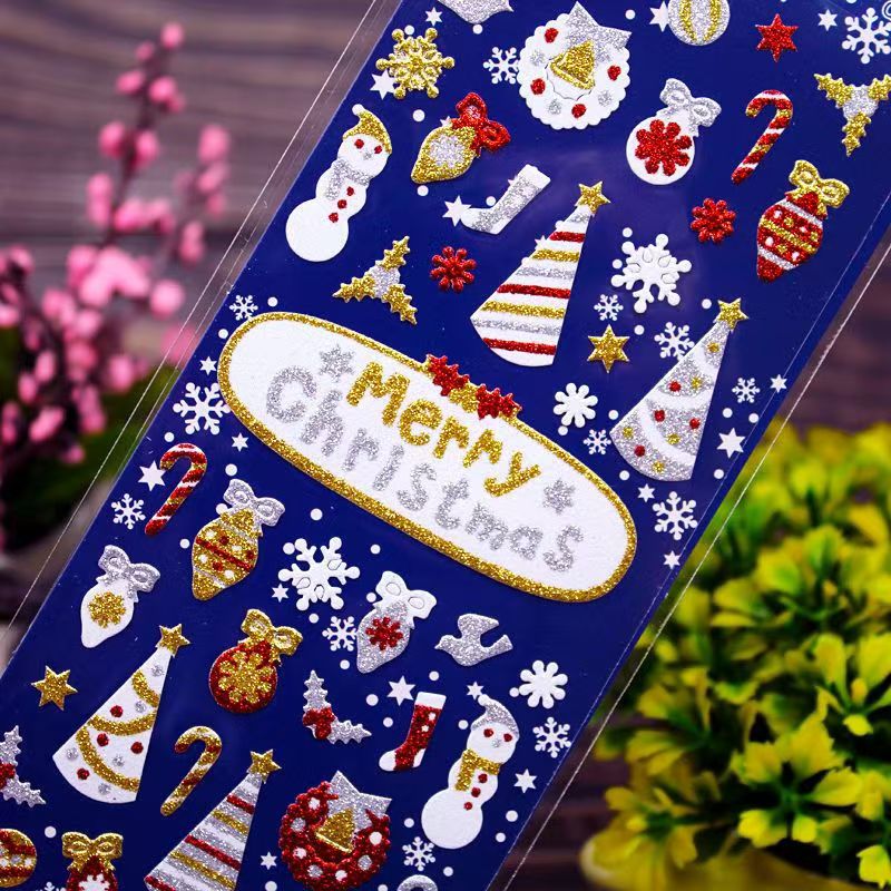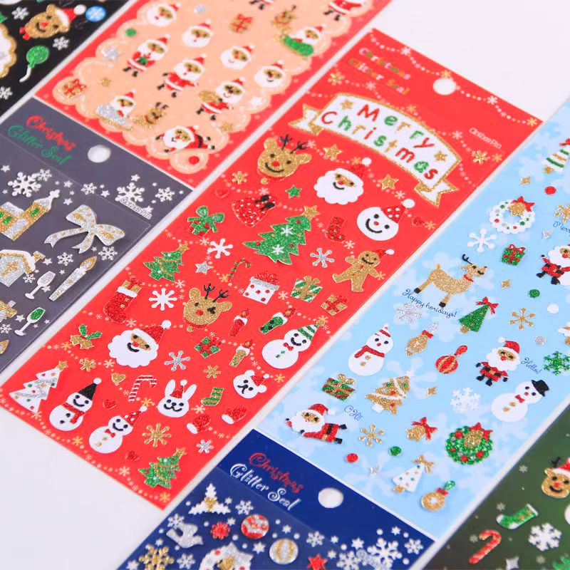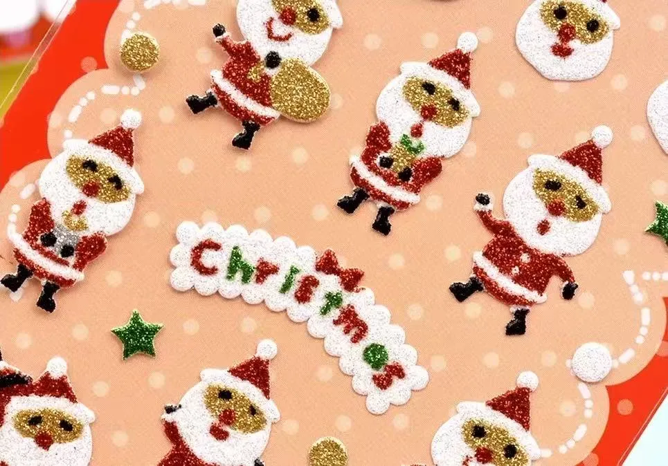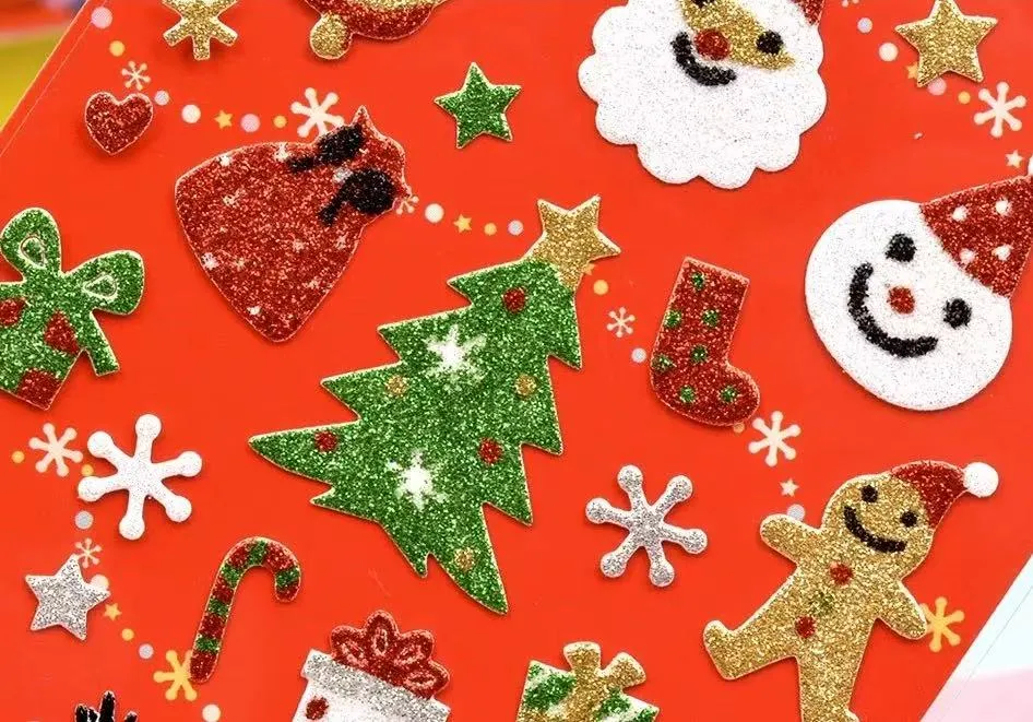 ສະຕິກເກີ້ glitter ວັນຄຣິດສະມາດສາມາດບັນລຸການຕິດກາວທີ່ດີເລີດໃນດ້ານທີ່ລຽບໆເຊັ່ນພາດສະຕິກ, ແກ້ວ, ໂລຫະແລະເຈ້ຍ.