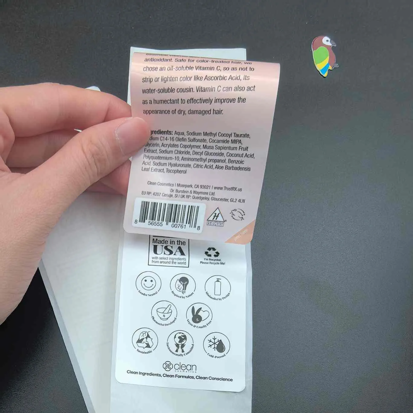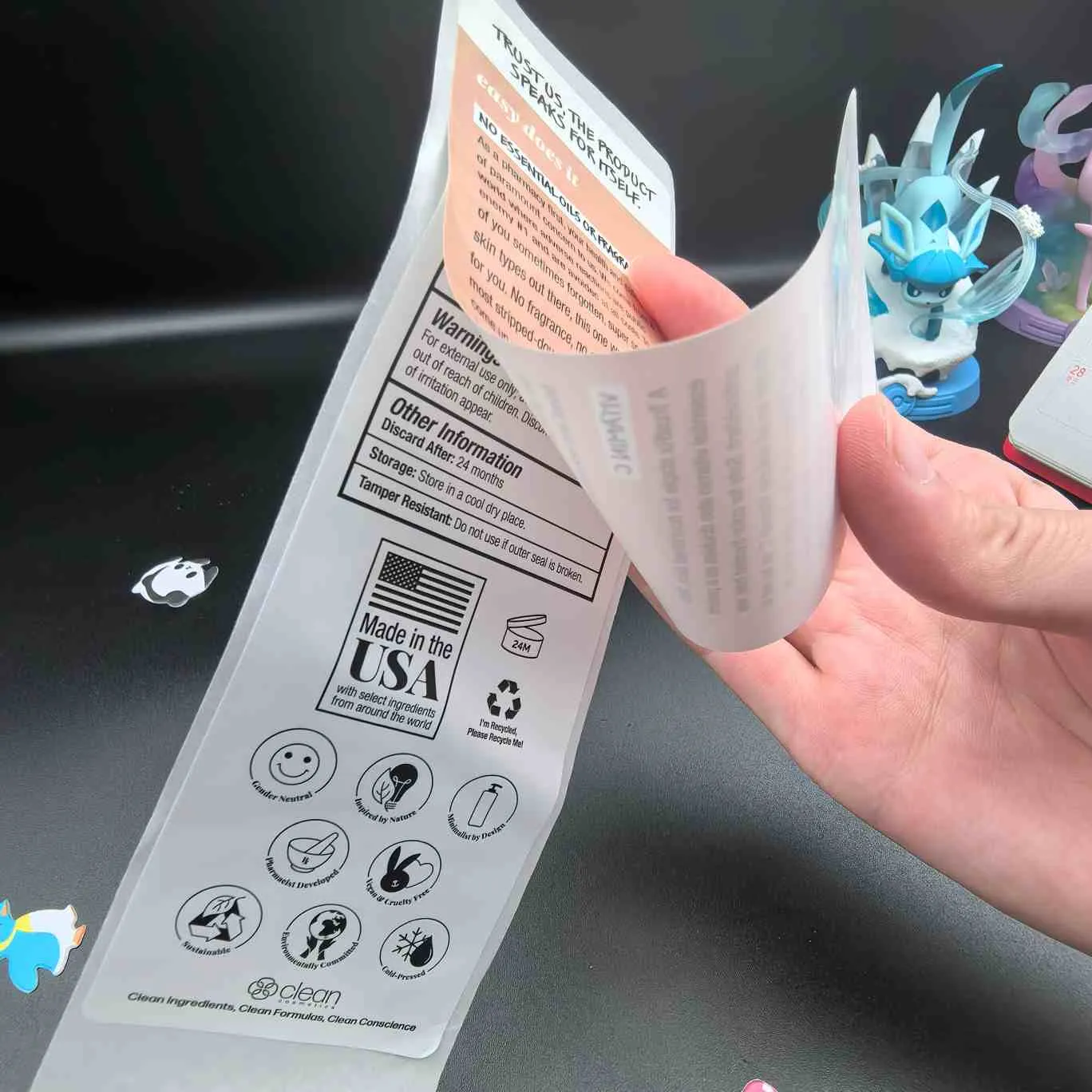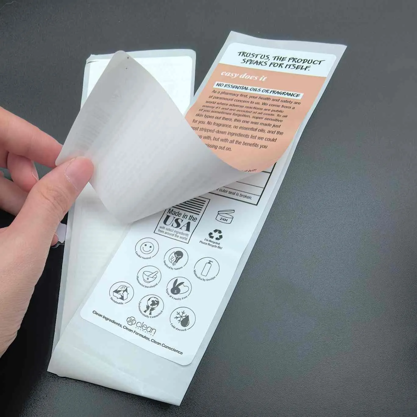 ປອກເປືອກແລະອ່ານປ້າຍຊື່:ປະເພດພື້ນຖານທີ່ສຸດ, ມັນຍັງຖືກເອີ້ນວ່າ Multilayer ສໍາລັບປ້າຍເຄື່ອງສໍາອາງຊັ້ນເທິງແມ່ນງ່າຍທີ່ຈະປອກເປືອກ, ແລະຊັ້ນໃນມີຂໍ້ມູນທີ່ຂະຫຍາຍ. ມັນມັກຖືກນໍາໃຊ້ສໍາລັບຫນ້າກາກໃບຫນ້າ, serums, ແລະຜະລິດຕະພັນນ້ອຍໆອື່ນໆ.